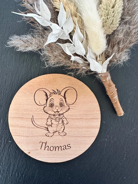 Wir bieten Getränkeuntersetzer aus Holz mit individuellem Namen graviert