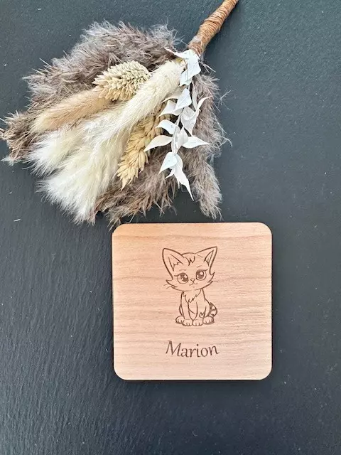 Wir bieten Getränkeuntersetzer aus Holz mit individuellem Namen graviert