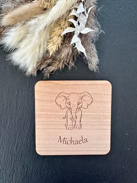 Wir bieten Getränkeuntersetzer aus Holz mit individuellem Namen graviert