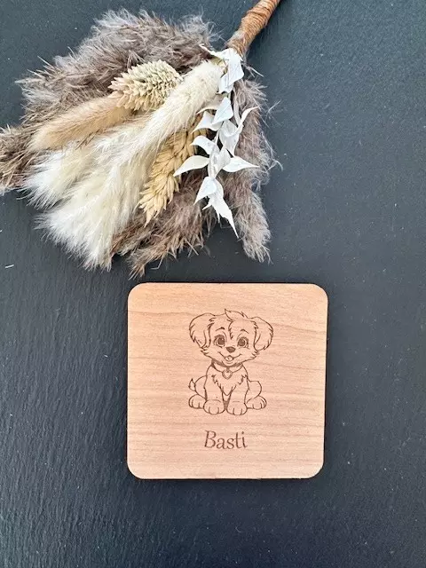 Wir bieten Getränkeuntersetzer aus Holz mit individuellem Namen graviert