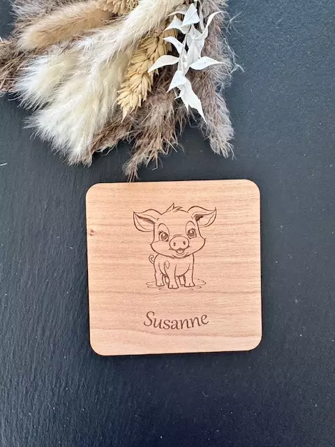 Wir bieten Getränkeuntersetzer aus Holz mit individuellem Namen graviert