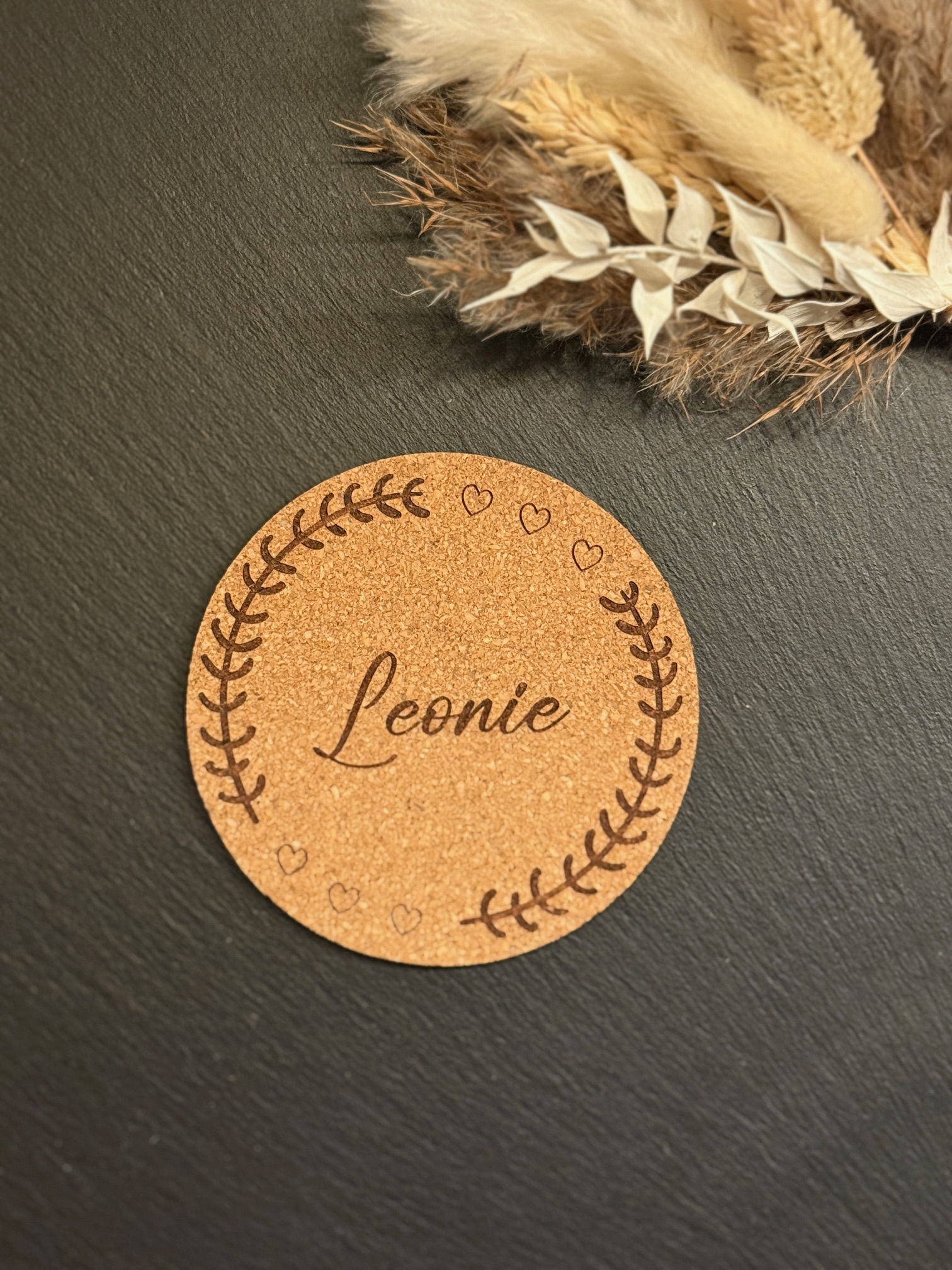 Wir bieten Getränkeuntersetzer aus Kork mit individuellem Namen graviert