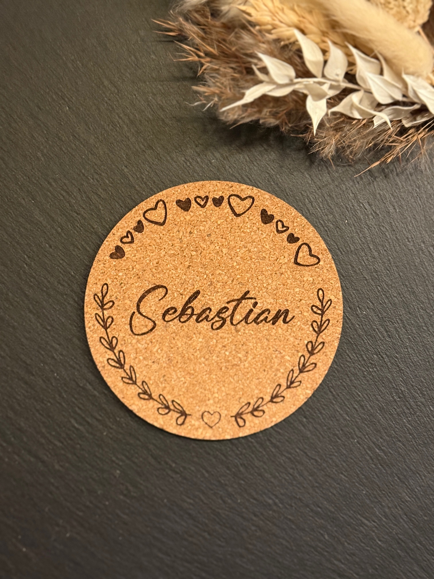 Wir bieten Getränkeuntersetzer aus Kork mit individuellem Namen graviert