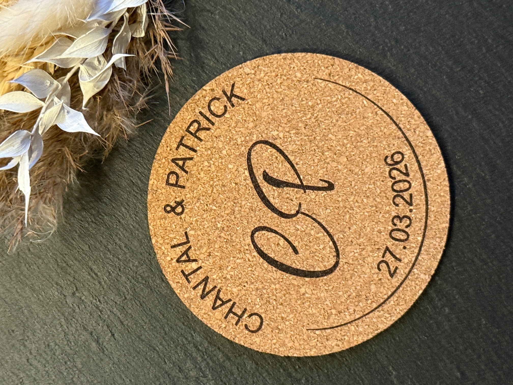 Wir bieten Getränkeuntersetzer aus Kork mit individuellem Namen graviert