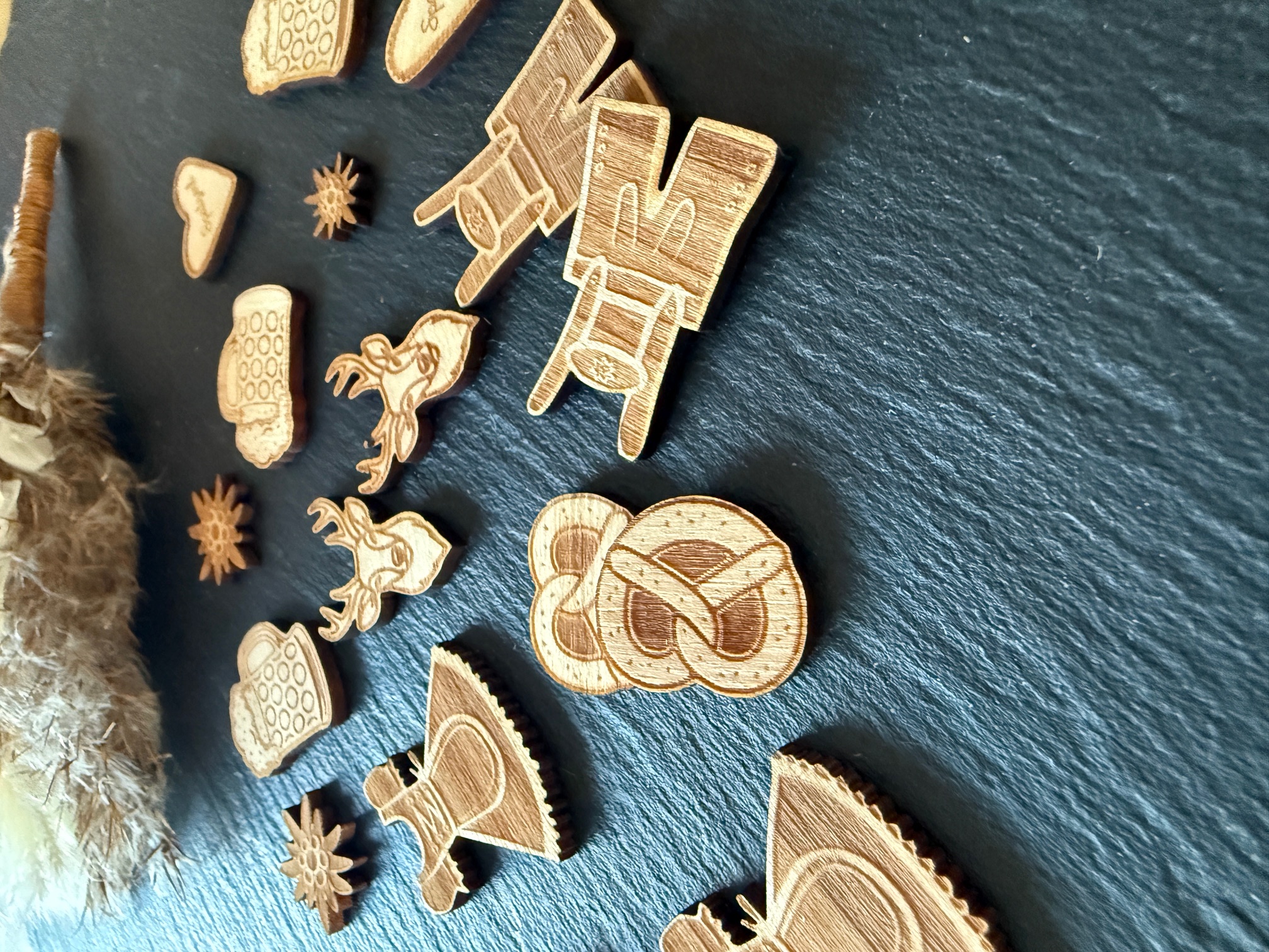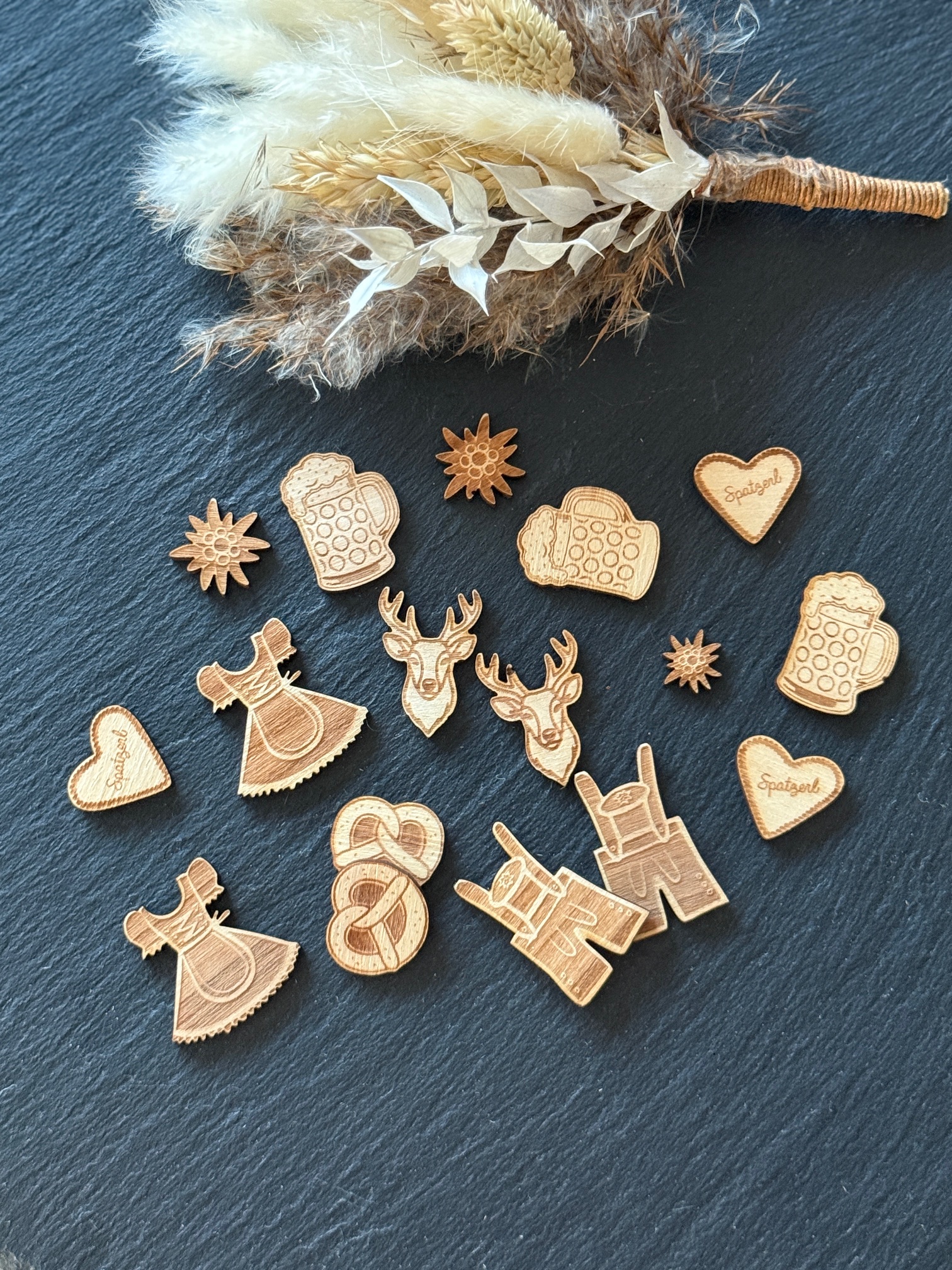 verschiedenen Formen und Figuren wie Dirndl, Lederhose, Edelweiß, Hirsch, Maßkrug, Brezel, Lebkuchenherz
